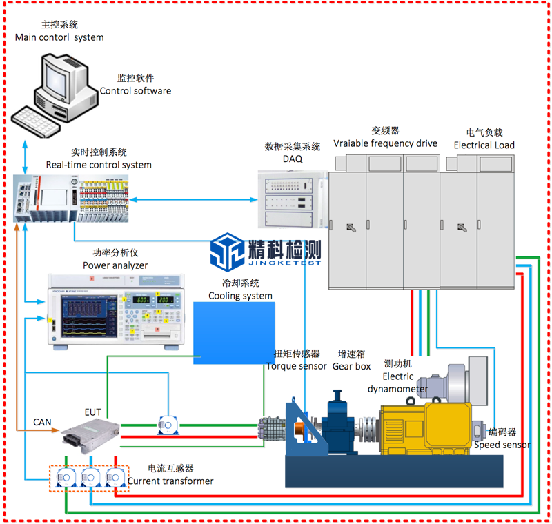 The test bench provides the communication interface with the cooling system purchased by the user; the communication interface with the power analyzer; the communication interface with the electrical load.