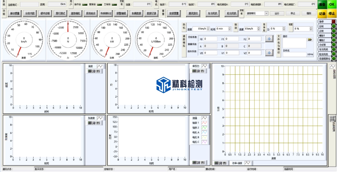 The real-time control system can independently control each wheel hub dynamometer, as well as master-slave control; it can also simulate road loads such as ramp resistance.