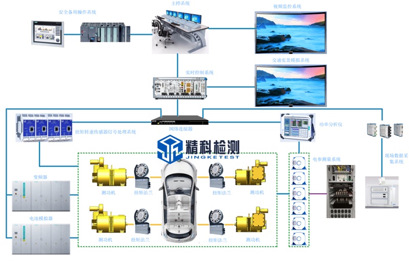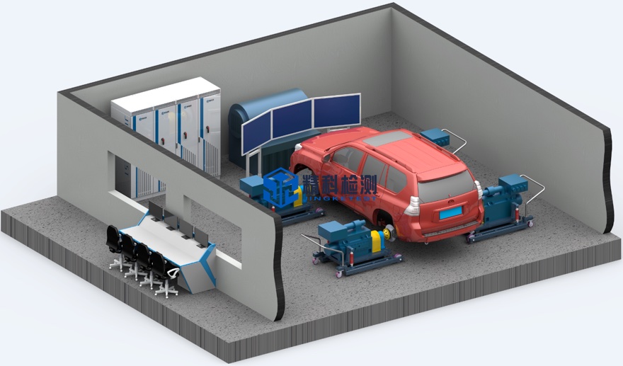 The vehicle axle coupling dynamometer test system consists of a mobile low-inertia electric dynamometer, dynamometer driver, battery simulator, electrical control cabinet, measurement sensors, vehicle windward cooling system, traffic real-life simulation system, main control computer, electrical Control cabinet and other components.